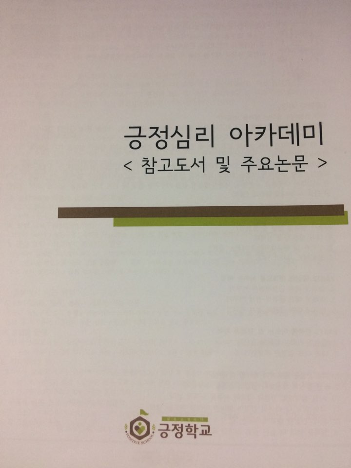 ![]() 긍정아카데미를 배우면서 읽는 참고도서 중 원하는 책을 읽어와서 자유롭게 나누는 긍정독서단입니다^^ 참고도서 목록 1. 긍정심리학 -마틴 셀리그만 2. 플로리시- 마틴셀리그만 3. 내안의 긍정을 춤추게 하라-바버라 프레드릭스 4. 긍정심리학 프라이머-크리스토퍼 피터슨 5. 인간의 강점발견하기-shane j. lopez 6. 정서적 경험 활용하기-shane j. lopez 7. 역경을 통해 성장하기-shane j. lopez 8. 인간의 번영 추구하기-shane j. lopez 9. 행복이란 무엇인가? - 탈벤샤하르 10. 행복의 조건-조지 베일런트 11. 행복의 신화-소냐 류보머스키 12. 행복은 전염된다-니컬러스 크리스태키스 13. 몰입의 즐거움-미하이 칙센트미하이 14. 모나리자 미소법칙-에드디너 ,로버트 비스워스 15. 긍정심리학 코칭기술-로버트 B. 디너 16. 긍정심리치료-Jeana L. Magyar-Moe 17. 긍정조직학-킴 카메론, 제인 듀톤, 로버트 퀸 등 |